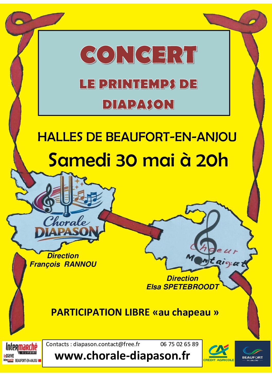 Les Halles Place Jeanne de Laval, Beaufort-en-Anjou, FranceLa chorale Diapason vous propose son concert de Printemps samedi 30 mai à 20h dans les Halles, place Jeanne de Laval. Avec une chorale invitée, Chorale Montaigut de Créteil (94).
