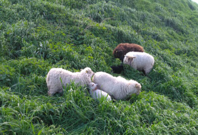 4 brebis et 2 agneaux de landes de Bretagne, âgés de 8 et 15 jours, sont arrivés mercredi 25 mars au matin. Ils ont naturellement pris possession des lieux dans le bel espace de verdure des ruines du château.